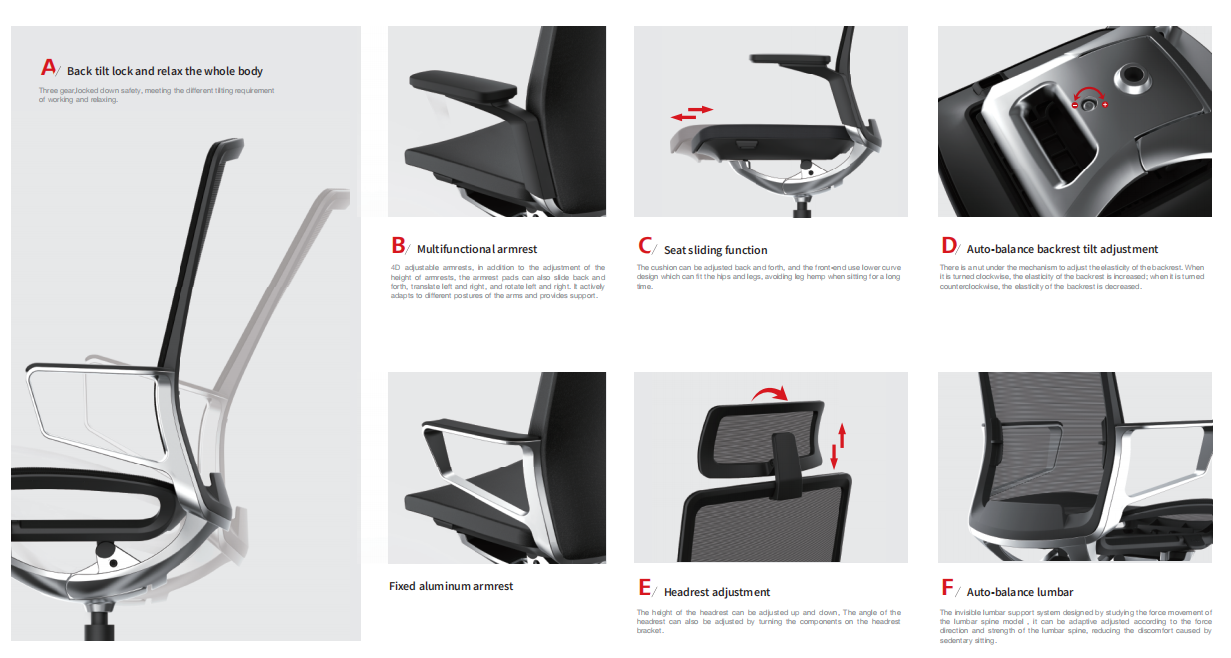 Dossier en maille double densité avec tension ajustable pour prévenir les douleurs. -